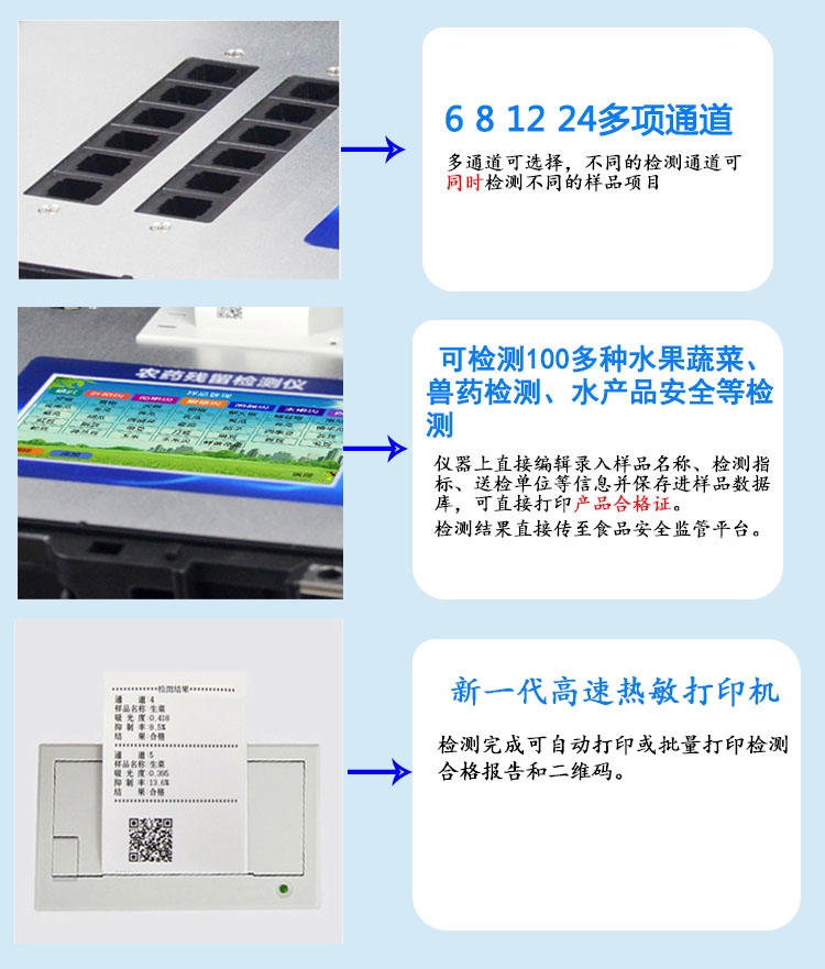 可快速检测几十种项目,包含各种蔬菜水果中有机磷、氨基甲酸酯类农药,各种肉食品中兽药残留:抗生素类残留、瘦肉精激素类残留;病害肉诊断:肉类新鲜度、肉中组胺、挥发性盐基氮;水产品安全筛查等现场的定性定量检测。 该检测仪为集成化肉品蔬菜水果安全快速检测分析设备,广泛应用于各类商超、批发市场、养殖场、屠宰场、食品肉产品深加工企业、检验检疫部门、食药监局、卫生部门、高教院校、科研院所、农业部门等单位使用。